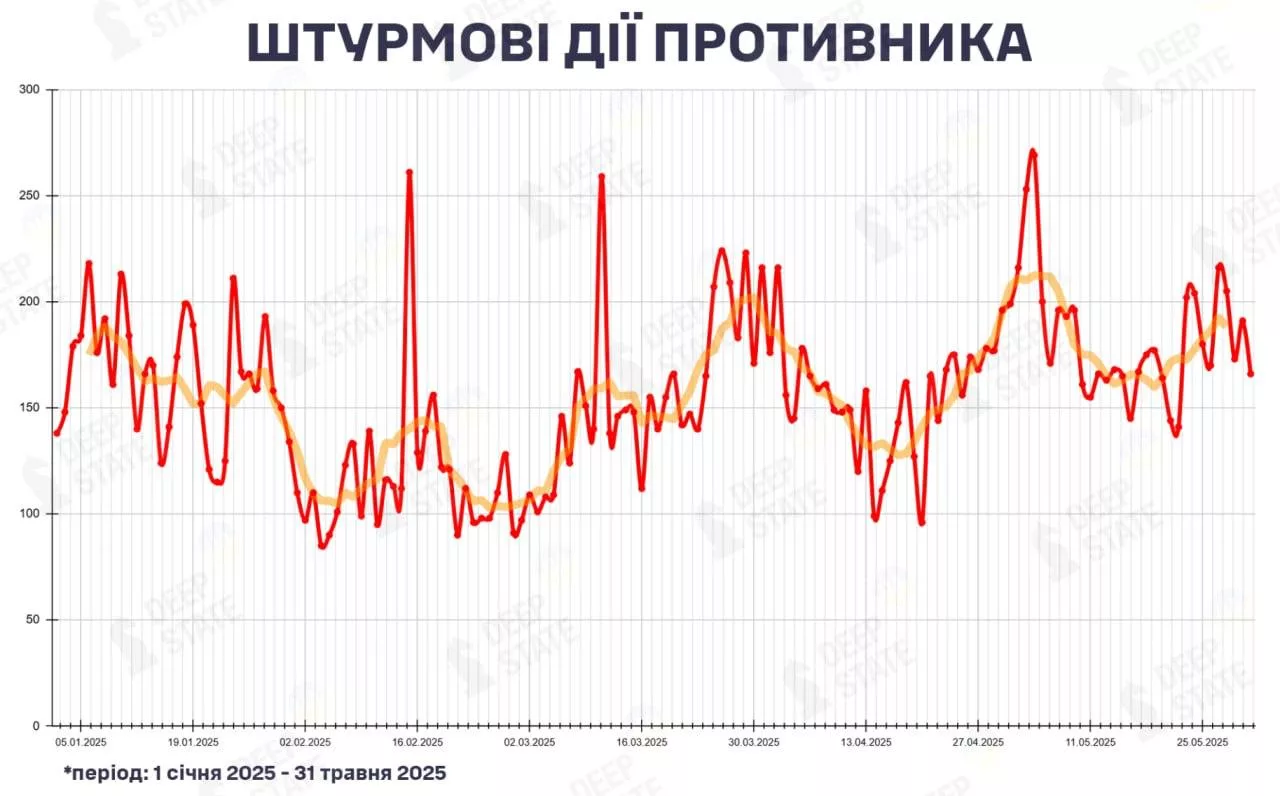 Аналитики подсчитали, что среднее число штурмов в сутки выросло с 154 в апреле до 184 в мае. Если в апреле более 190 атак в день фиксировалось лишь дважды, то в мае — уже 13 раз. Рекорд — 269 атак 4 мая.