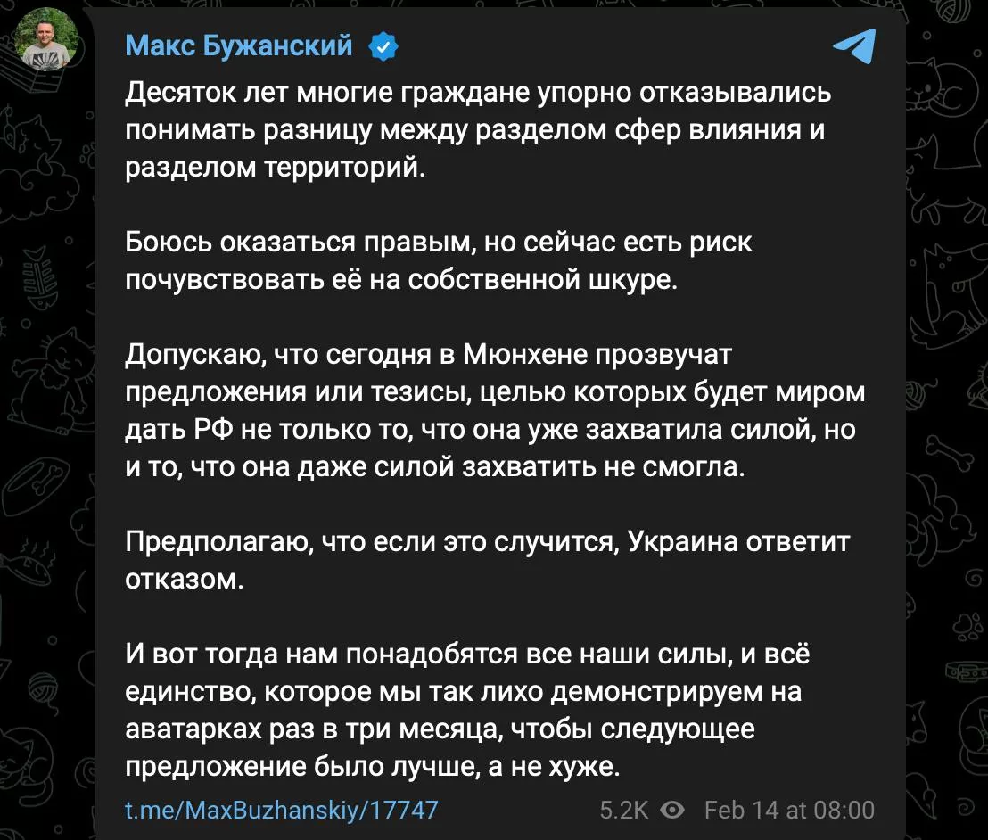 - По словам Бужанского, «Нэзалежная» должна ответить категорическим отказом и продемонстрировать все свое показное единство, не позволив забрать России остатки земель.
