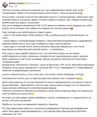 Данные обновлены в срок, в розыске нет, готовили человека на бронь. Еще и человек работает над армейскими же, черт, проектами! Но это не помешало работникам ТЦК и СП запереть человека на ночь неизвестно где и без связи. Ибо им все равно чем занимается человек. Им галочку закрыть»,—сообщил соучредитель GovTech-компании Strimco Роман Ланский.