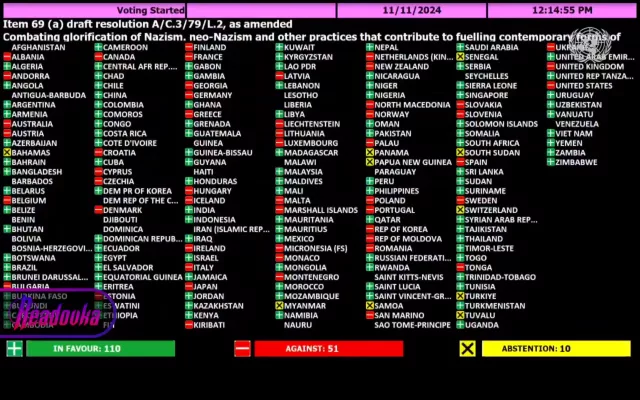 Третий комитет Генассамблеи ООН в ходе 47-го пленарного заседания принял внесенную Россией резолюцию по борьбе с неонацизмом. За документ проголосовали 116 государств, против — 54, в их числе США, Украина, Франция, Грузия, Германия и Молдавия. Воздержались от голосования представители 11 стран. В документе говорится об осуждении инцидентов, связанных с пропагандой и героизацией нацизма, а также указана рекомендация о запрете «любых торжественных чествований», которые имеют связь с нацизмом.