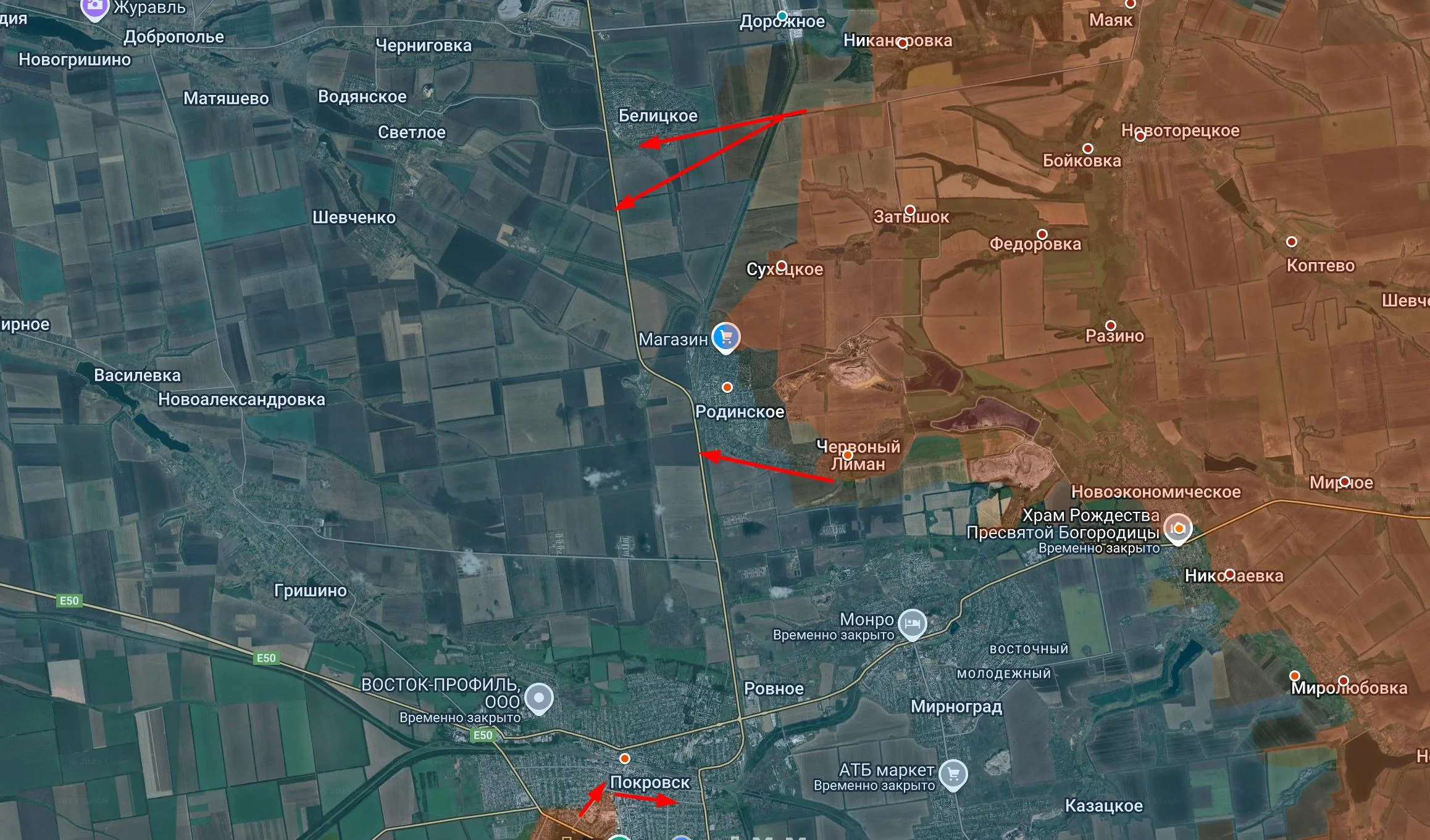 Наступление российских войск продолжается не только непосредственно внутри Покровска, но и развивается севернее, в районе Белицкого в нескольких километрах севернее.