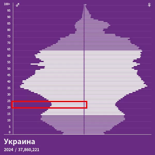 Тем не менее, к моменту, когда данное решение будет принято украинскими властями, это также уже не сможет оказать значительное влияние на происходящее по одной очень простой причине — «возрастная пирамида» населения Украины (первое фото к посту) говорит нам о том, что мужчины в возрасте от 21 до 25 лет буквально составляют меньшинство ее населения. И это на фоне того, что основная мобилизуемая сейчас категория населения Украины возрастной группы от 35 до 45 хотя и составляет большинство ее населения, но уже не способна достаточно пополнять войска.