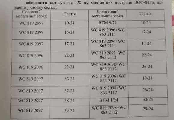 На фото представлен список партий основных и дополнительных зарядов, которые, вероятно, запрещены к использованию из-за опасности для миномётных расчётов. Также имеется видео, демонстрирующее последствия применения таких зарядов: мина застряла в стволе, а остальные лежат в поле в нескольких метрах от миномёта.