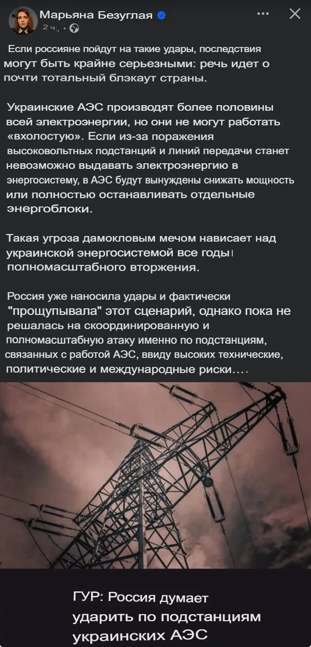 Сама Безуглая заявила, что при поражении ключевых узлов энергосистемы страна может столкнуться с почти полным блэкаутом. По её словам, наибольшие риски связаны с высоковольтными подстанциями и линиями электропередачи, обеспечивающими работу атомных электростанций, которые дают более половины всей электроэнергии на Украине.