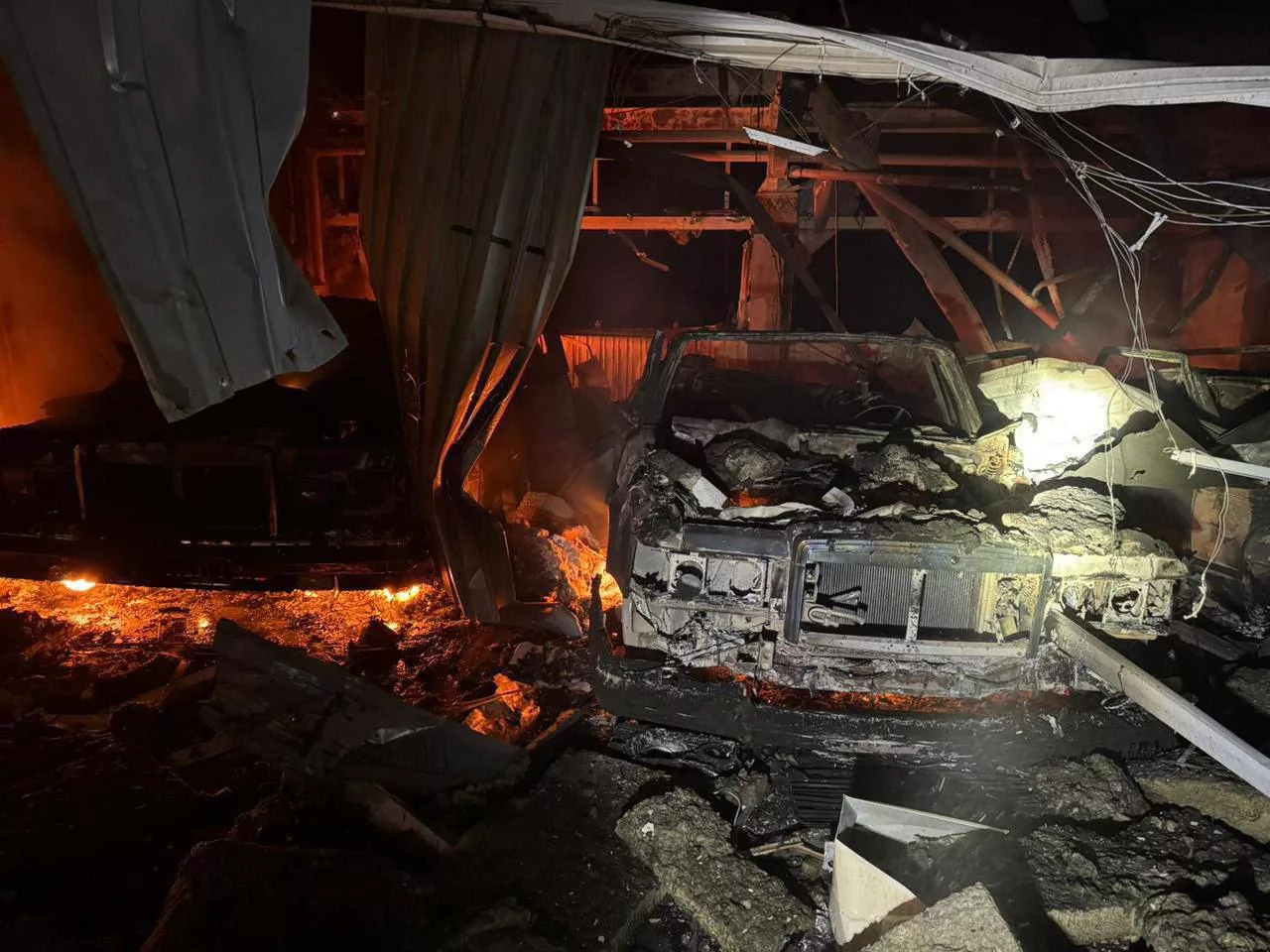 В ангаре уничтожены девять автомобилей, еще 27 повреждены. На данный момент пожар ликвидирован.