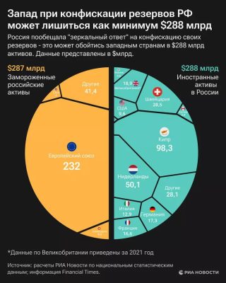 Ответ убил — на $287 миллиардов замороженных активов РФ на Западе приходится $288 миллиардов в РФ. Разумеется, тоже не в виде золотых слитков и выдернуть их тоже будет не так уж и просто. Однако факт остается фактом — в случае конфискаций, обмен будет равноценным.