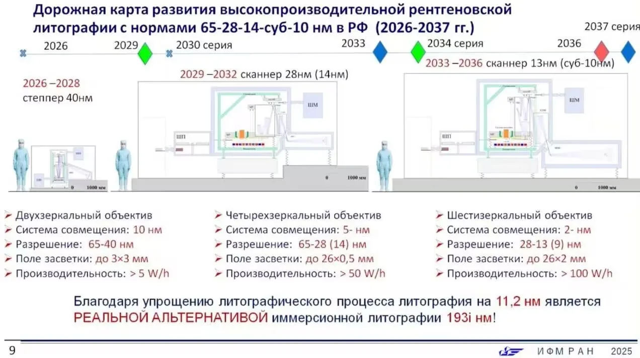 — Первый этап (2026–2028 годы): Создание литографа для 40-нанометрового техпроцесса со скоростью более пяти пластин в час;