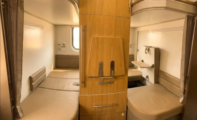 Главное отличие — капсульная компоновка. Теперь полка превращается в личную зону с изоляцией, обеспечиваемой шторками. Верхние места стали шире, а спальные поверхности увеличены на 20 сантиметров. Для семей или групп предусмотрена возможность соединения двух полок через специальное окно в перегородке. Это решение особенно актуально для тех, кто ценит уединение или заботится о детях.