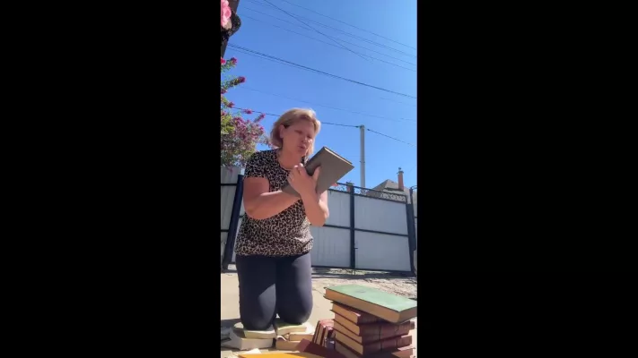 «Чтобы это не распространялось по Украине, чтобы это не читали всякие гниды», — заявляет женщина и рвет книги, которые потом планирует сдать на макулатуру.