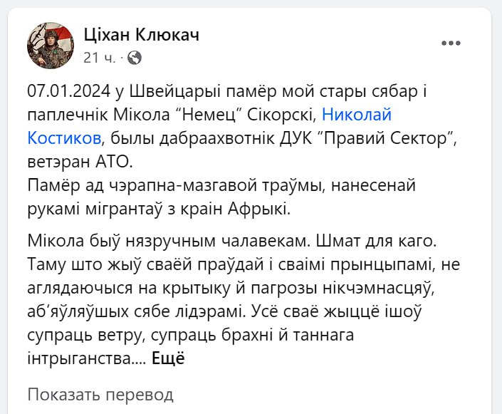 Белорусский националист Николай Костиков уехал в Швейцарию полгода назад после контузии. В конце прошлого года был избит мигрантами с Африки и умер в больнице.