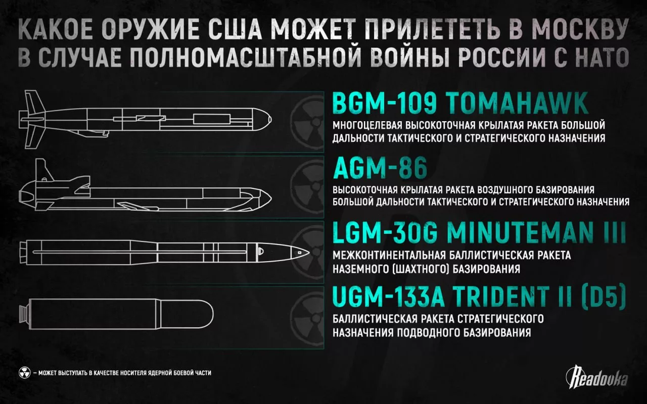 Безусловно, при полномасштабной атаке в ход пойдут и более серьезное вооружение НАТО — в случае прямого столкновения с альянсом будет применена ядерная триада США для «обезоруживающего удара» — МБР LGM-30G Minuteman III наземного базирования, из воздушного базирования — крылатая ракета AGM-86, все та же ракета BGM-109 Tomahawk с ядерной боевой частью, а также UGM-133A Trident II (D5), которые установлены на подводных лодках.
