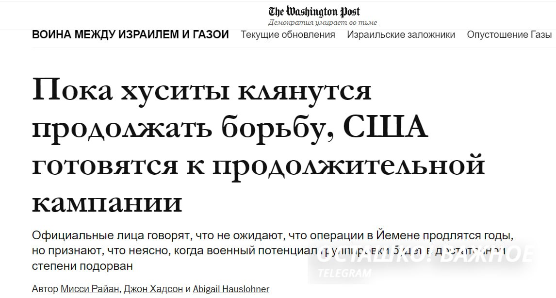 ⚫️ Однако отмечается, что американские военные не станут оккупировать территорию Йемена – целью операции является ограничить военный потенциал хуситов настолько, чтобы они не могли атаковать корабли в Красном море. Для этого планируется наносить только ракетные удары — ни о какой наземной операции пока что речи не идет.