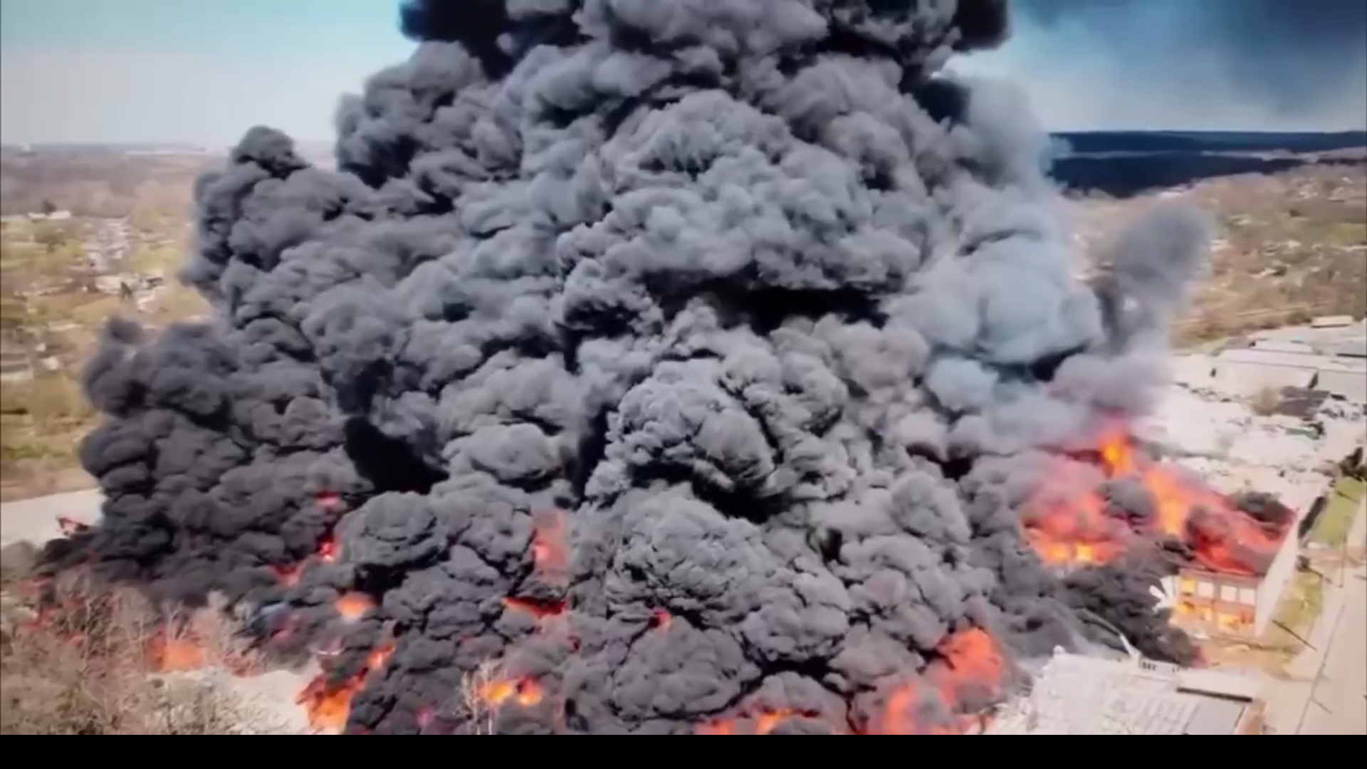 При пожаре завод выбросил огромное облако токсичного черного дыма, видимого на расстоянии десяти километров. Есть риск взрывов емкостей с пропаном, которые находятся на территории завода
