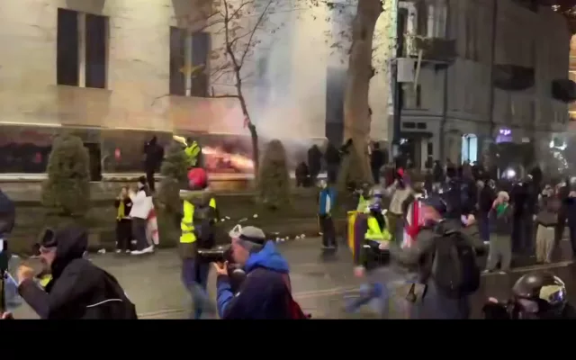 В ответ на обстрелы пиротехникой грузинская полиция водометами стала оттеснять протестующих с проспекта Руставели в Тбилиси, некоторых задержали. Примерно к 2 часам ночи протест разогнали и силовики и спецтехника покинули территорию.