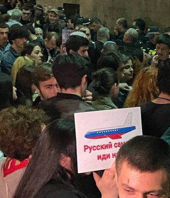 Протестующие собрались возле офиса грузинской авиакомпании Georgian Airways. В основном на улицу вышли молодые люди, возрастных жителей Грузии в толпе крайне мало.