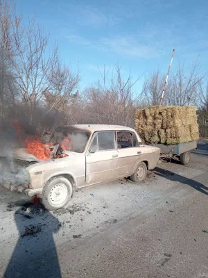 - На автомобильной дороге Токмак – Васильевка в Запорожской обл. дрон ВСУ атаковал автомобиль ВАЗ-2106 с прицепом. За рулем был фермер, который перевозил сено. В результате атаки автомобиль уничтожен. Водитель, к счастью, не пострадал (фото 1-2).