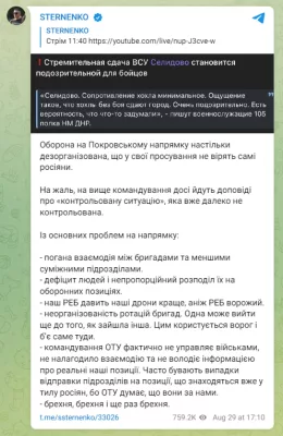 Стерненко приводит целый список причин дезорганизации обороны ВСУ на Покровском направлении. Среди них: