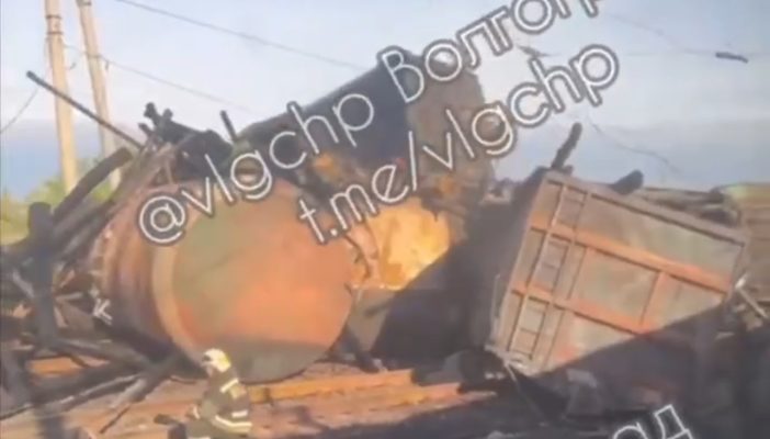 В Волгоградской области с утра БпЛА ВСУ атаковал грузовой состав — девять вагонов сошли с рельс, два вагона с топливом загорелись, а одна цистерна взорвалась спровоцировав возгорание прилегающей местности.