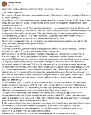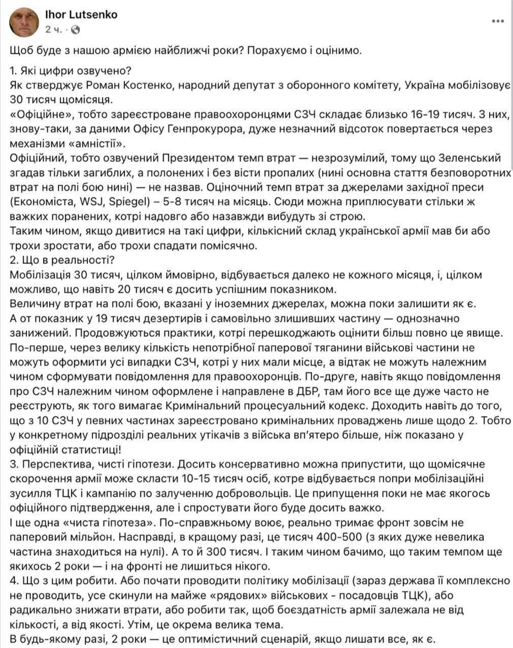 «Что с этим делать. Или начать проводить политику мобилизации (сейчас государство ее комплексно не проводит, все сбросили на почти «рядовых» военных — должностных лиц ТЦК), или радикально снижать потери, или делать так, чтобы боеспособность армии зависела не от количества, а от качества», — считает он