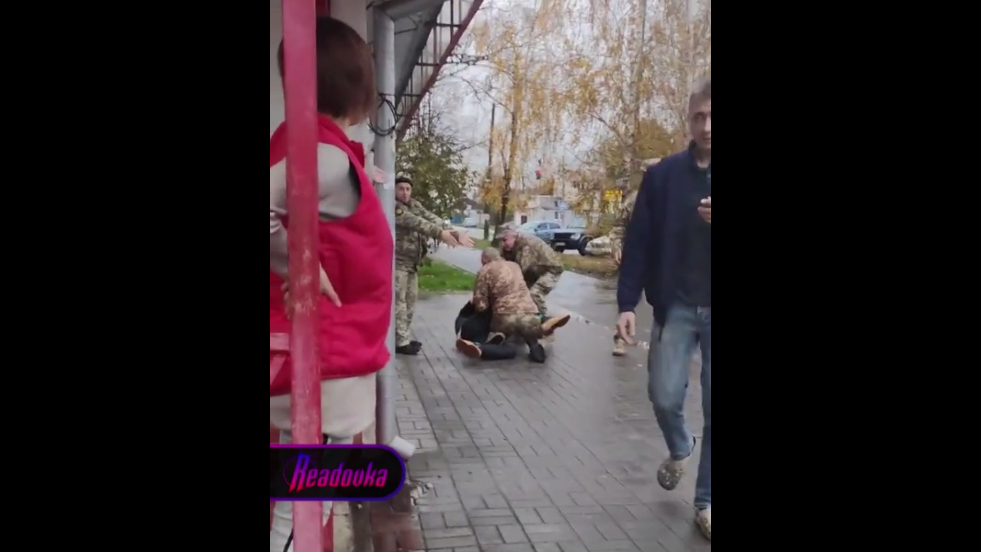 В Житомире украинские военкомы разыграли очередное шоу-задержание: трое мужчин средь бела дня пытались «утащить» прохожего призывного возраста, а четвертый стоял в сторонке и командовал группой. Молодого человека уже скрутили и прижали к асфальту. Но не тут-то было — парень не желал отправляться на убой и начал сопротивляться «могилизаторам», которые увидели в нем жертву.
