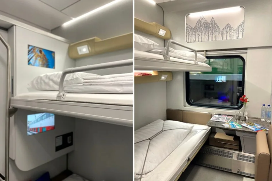 Внутреннее оснащение также претерпело серьёзные изменения. В каждом купе появились откидной стул, столик с тумбой, лестница для подъёма на верхнюю полку, а также выдвижные экраны с возможностью выбора контента. Для зарядки гаджетов предусмотрены розетки на 220 В и USB-разъёмы, а для хранения вещей — концевые сейфы. В ванной комнате установлен глубокий шкаф для одежды. Интерьер выполнен в светлых бежевых тонах, что визуально расширяет пространство и создаёт ощущение уюта. Особое внимание уделено дальним маршрутам: одно из купе оборудовано душевой кабиной, что становится настоящим преимуществом для пассажиров в длительных поездках.