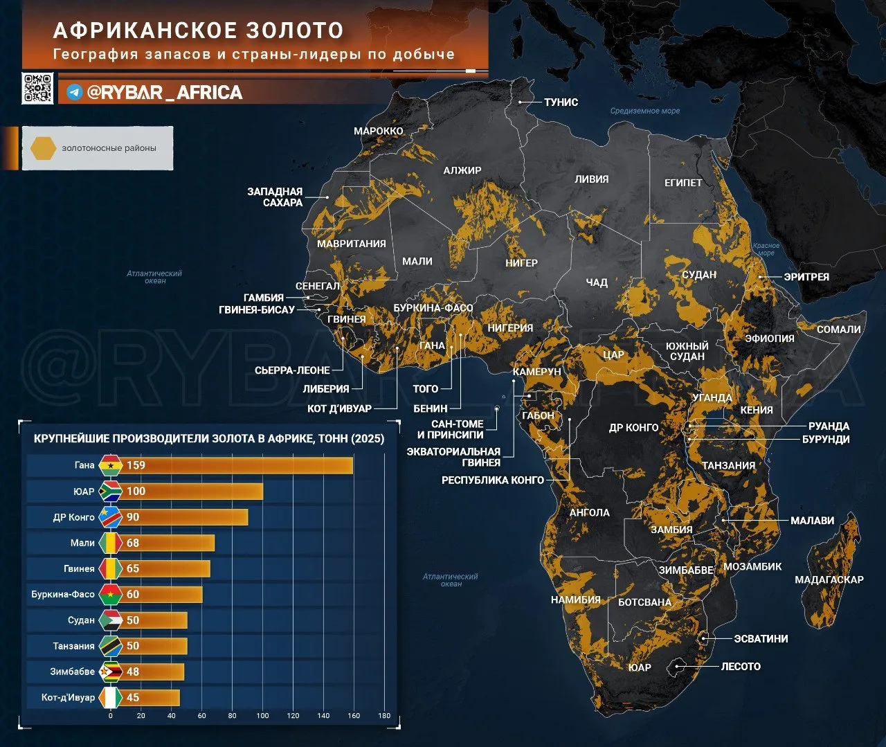За прошедший год в десятку лидеров по объёмам добычи вошли Гана, ЮАР, ДРК, Мали, Гвинея, Буркина-Фасо, Судан, Танзания, Зимбабве и Кот-д’Ивуар, причём на первые две страны приходится треть всей африканской добычи.