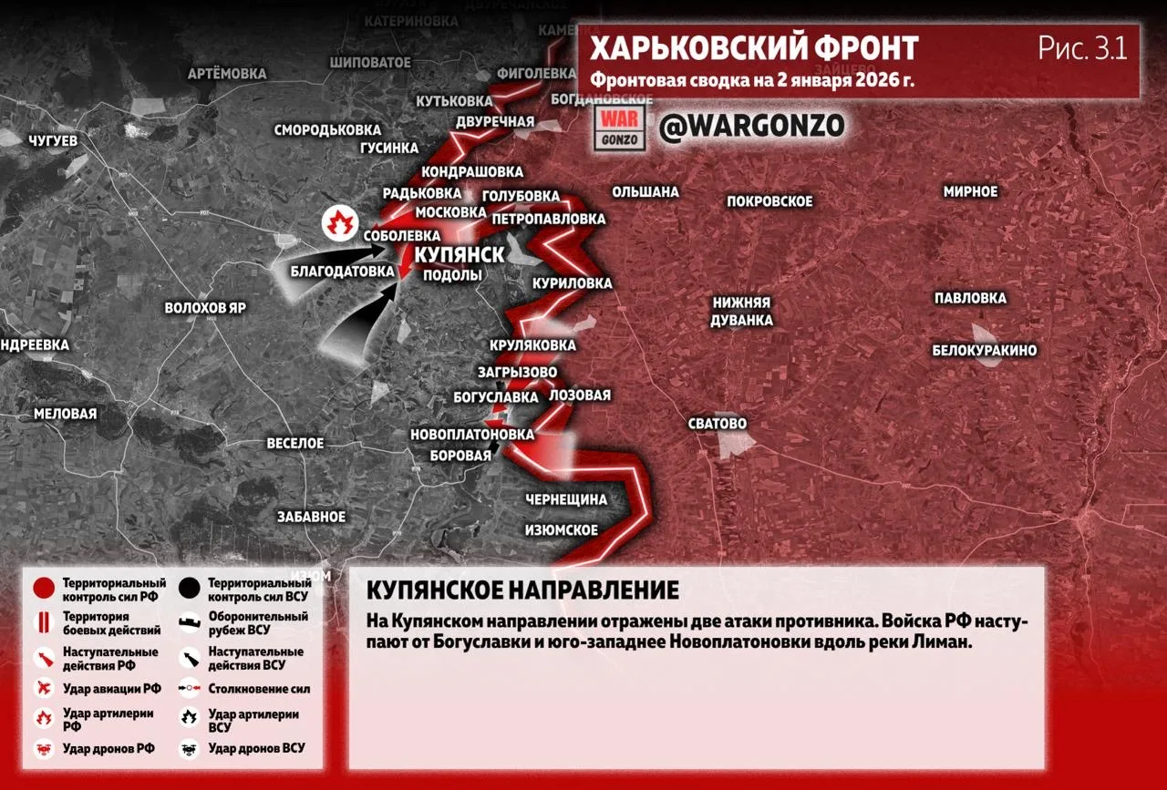 На Купянском направлении отражены две атаки противника. Войска РФ наступают от Богуславки и юго-западнее Новоплатоновки вдоль реки Лиман. (Рис. 3.1)