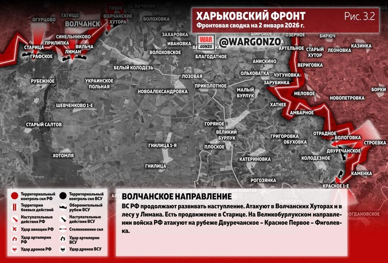 На Волчанском направлении ВС РФ продолжают развивать наступление. Атакуют в Волчанских Хуторах и в лесу у Лимана. Есть продвижение в Старице. На Великобурлукском направлении войска РФ атакуют на рубеже Двуречанское – Красное Первое – Фиголевка. (Рис. 3.2)