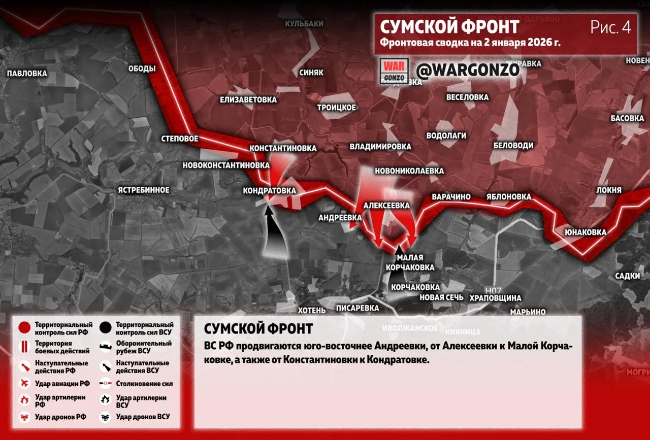 ВС РФ продвигаются юго-восточнее Андреевки, от Алексеевки к Малой Корчаковке, а также от Константиновки к Кондратовке. (Рис. 4.)