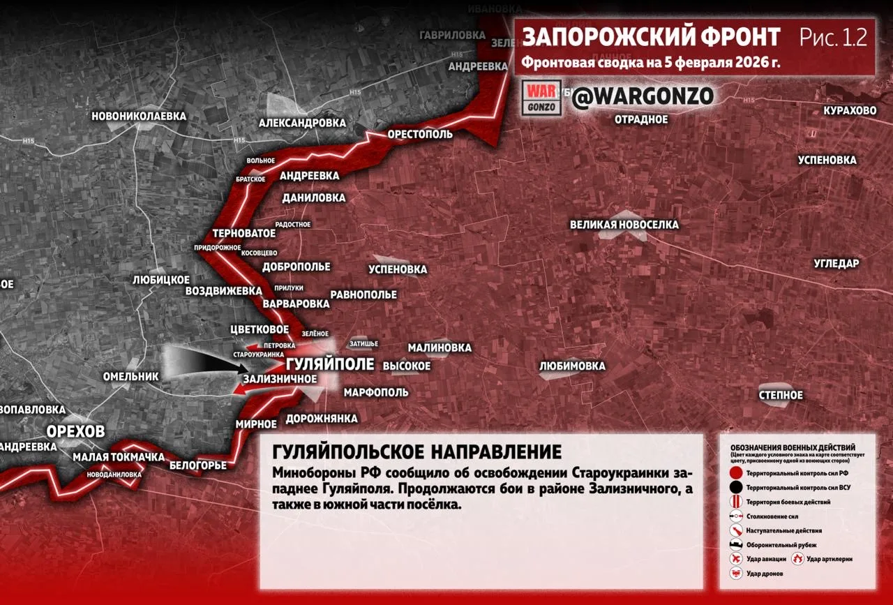 Минобороны РФ сообщило об освобождении Староукраинки западнее Гуляйполя. Продолжаются бои в районе Зализничного, а также в южной части посёлка. (Рис. 1.2)