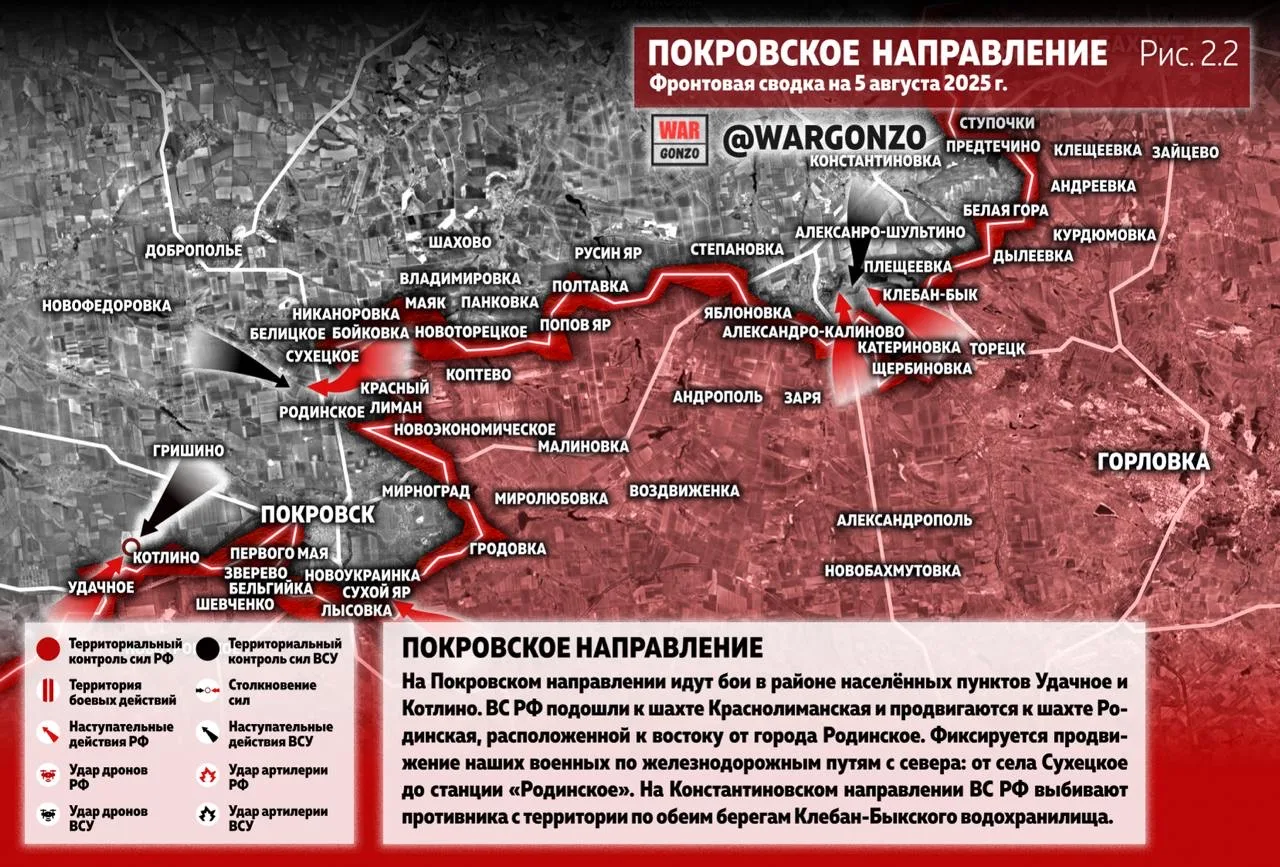 Донецкий фронт. Появляются сообщения о начале штурма населённого пункта Искра на Южно-Донецком направлении. На Покровском направлении идут бои в районе населённых пунктов Удачное и Котлино. ВС РФ подошли к шахте Краснолиманская и продвигаются к шахте Родинская, расположенной к востоку от города Родинское. Фиксируется продвижение наших военных по железнодорожным путям с севера: от села Сухецкое до станции «Родинское». На Константиновском направлении ВС РФ выбивают противника с территории по обеим берегам Клебан-Быкского водохранилища. (Рис. 2)