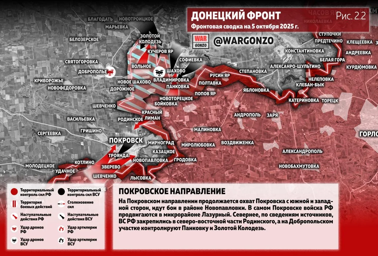 На Покровском направлении продолжается охват Покровска с южной и западной сторон, идут бои в районе Новопавловки. В самом Покровске войска РФ продвигаются в микрорайоне Лазурный. Севернее, по сведениям источников, ВС РФ закрепились в северо-восточной части Родинского, а на Добропольском участке контролируют Панковку и Золотой Колодезь. (Рис. 2.2)