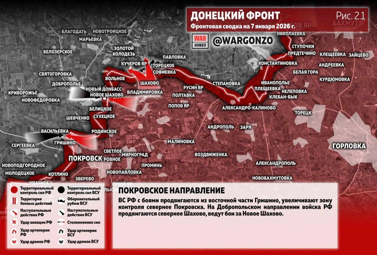 На Покровском направлении ВС РФ с боями продвигаются из восточной части Гришино, увеличивают зону контроля севернее Покровска. На Добропольском направлении войска РФ продвигаются севернее Шахово, ведут бои за Новое Шахово. (Рис. 2.1)