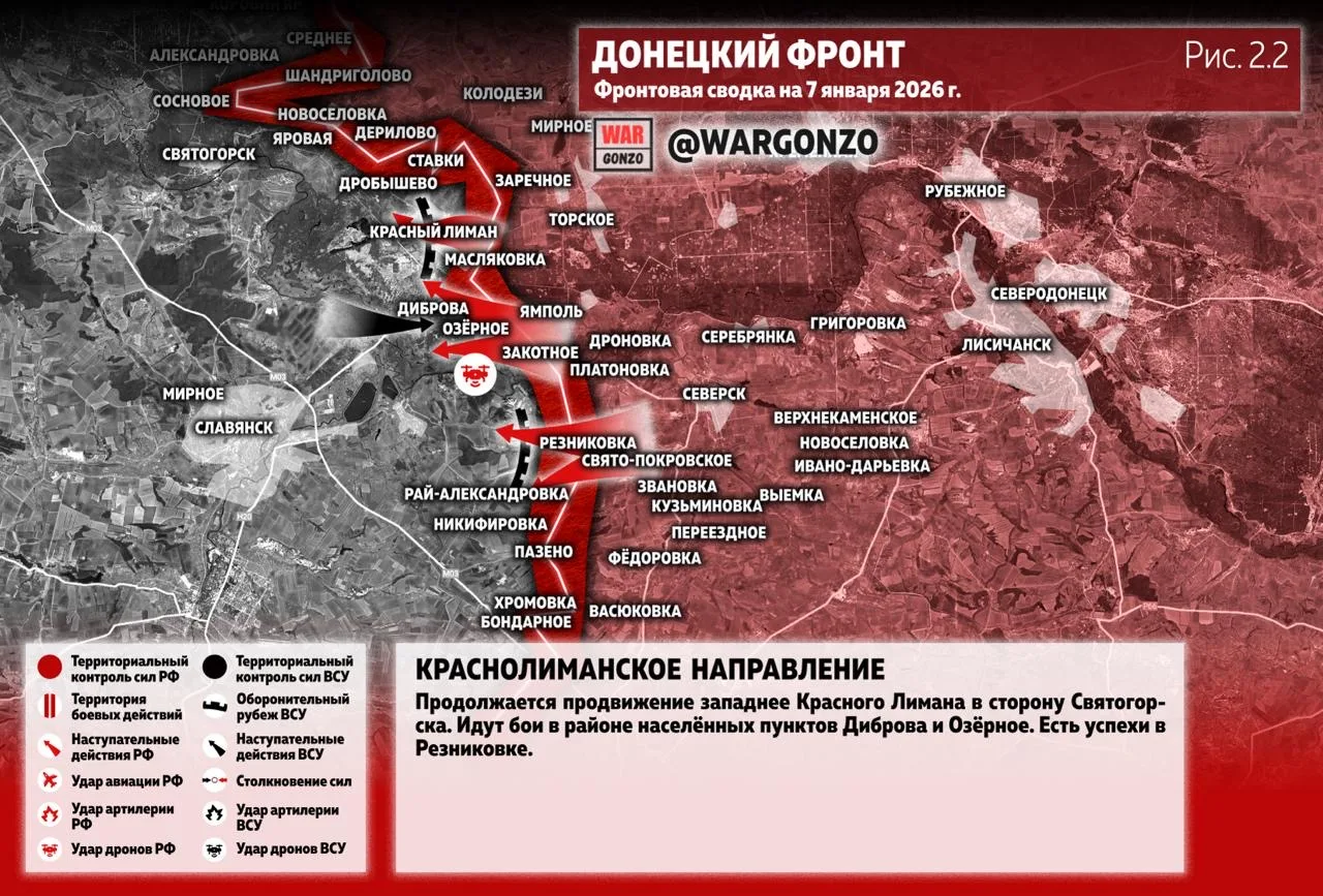 На Краснолиманском направлении продолжается продвижение западнее Красного Лимана в сторону Святогорска. Идут бои в районе населённых пунктов Диброва и Озёрное. Есть успехи в Резниковке. (Рис. 2.2)