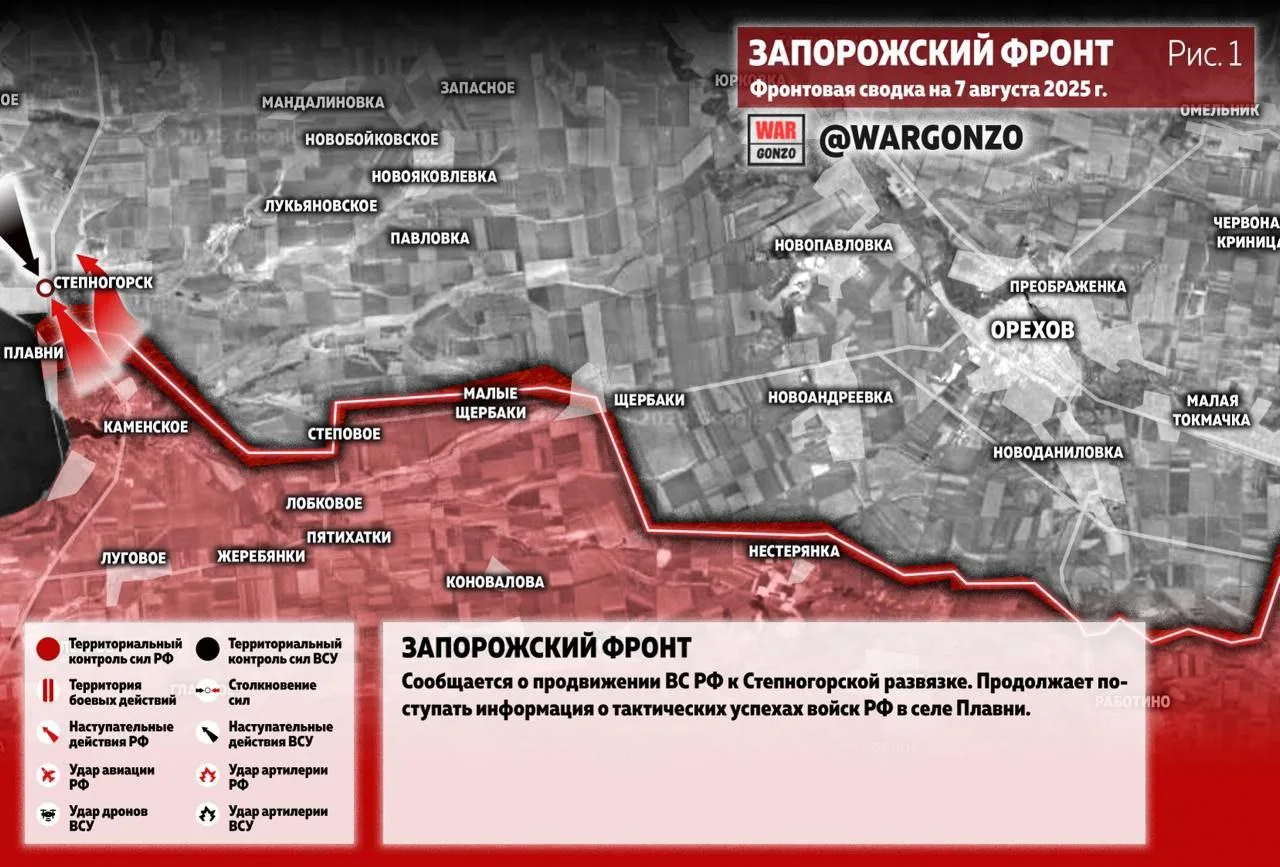 Запорожский фронт. Сообщается о продвижении ВС РФ к Степногорской развязке. Продолжает поступать информация о тактических успехах войск РФ в селе Плавни. (Рис. 1)