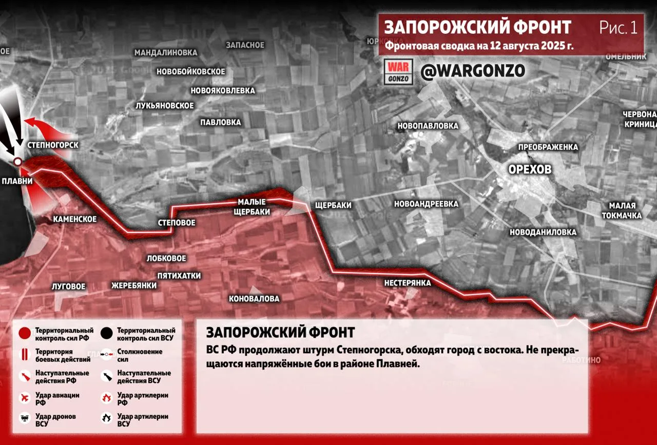 Запорожский фронт. ВС РФ продолжают штурм Степногорска, обходят город с востока. Не прекращаются напряжённые бои в районе Плавней. (Рис. 1)