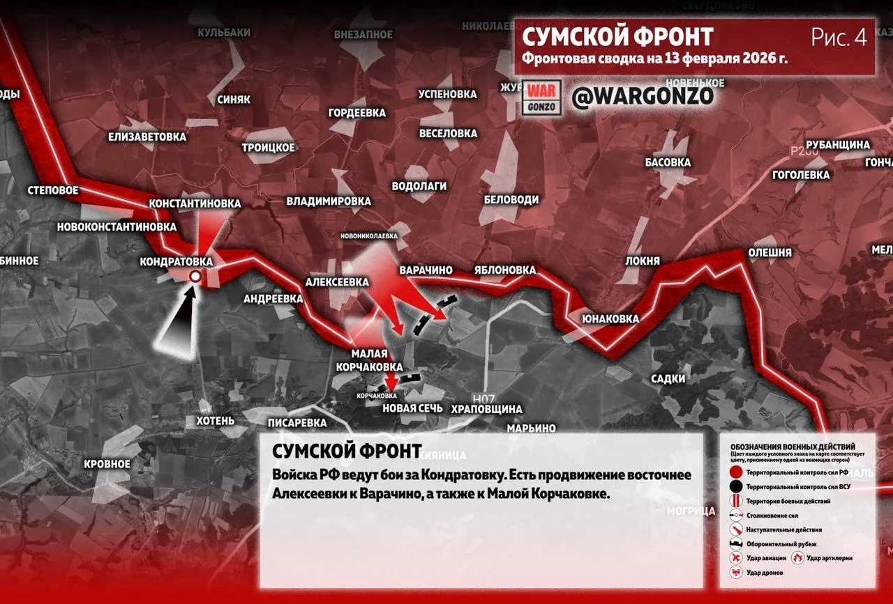 Войска РФ ведут бои за Кондратовку. Есть продвижение восточнее Алексеевки к Варачино, а также к Малой Корчаковке. (Рис. 4)
