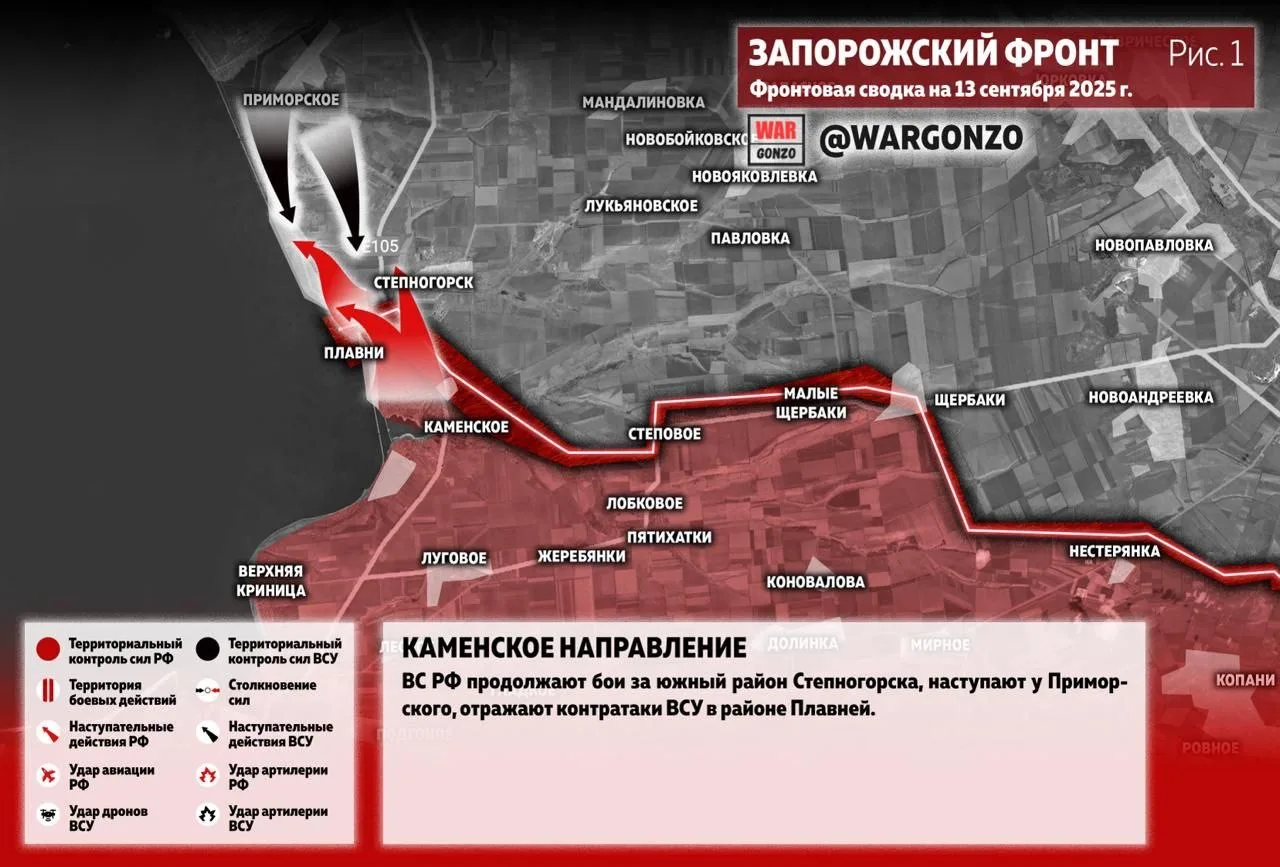 ВС РФ продолжают бои за южный район Степногорска, наступают у Приморского, отражают контратаки ВСУ в районе Плавней. (Рис. 1)