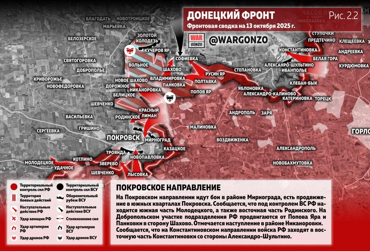 На Покровском направлении идут бои в районе Мирнограда, есть продвижение в южных кварталах Покровска. Сообщается, что под контролем ВС РФ находится южная часть Молодецкого, а также восточная часть Родинского. На Добропольском участке подразделения РФ продвигаются от Попова Яра и Панковки в сторону Шахово. Отмечается наступление в районе Никаноровки. (Рис. 2.2)