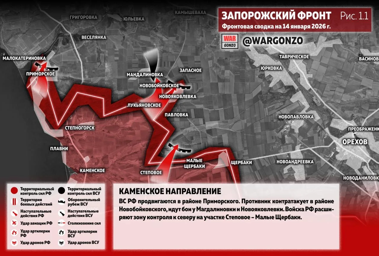 ВС РФ продвигаются в районе Приморского. Противник контратакует в районе Новобойковского, идут бои у Магдалиновки и Новояковлевки. Войска РФ расширяют зону контроля к северу на участке Степовое – Малые Щербаки. (Рис. 1.1)