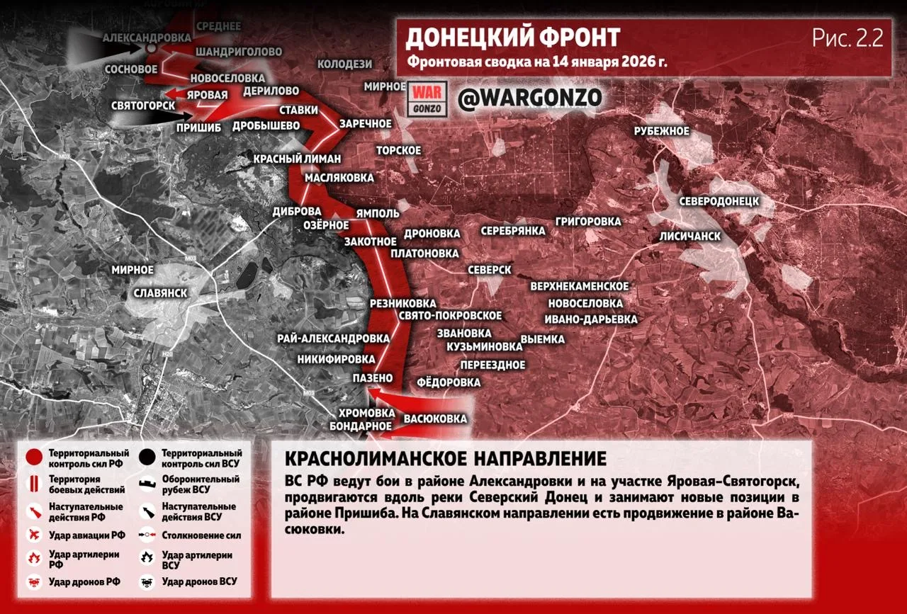 На Краснолиманском направлении ВС РФ ведут бои в районе Александровки и на участке Яровая–Святогорск, продвигаются вдоль реки Северский Донец и занимают новые позиции в районе Пришиба. На Славянском направлении есть продвижение в районе Васюковки. (Рис. 2.2)