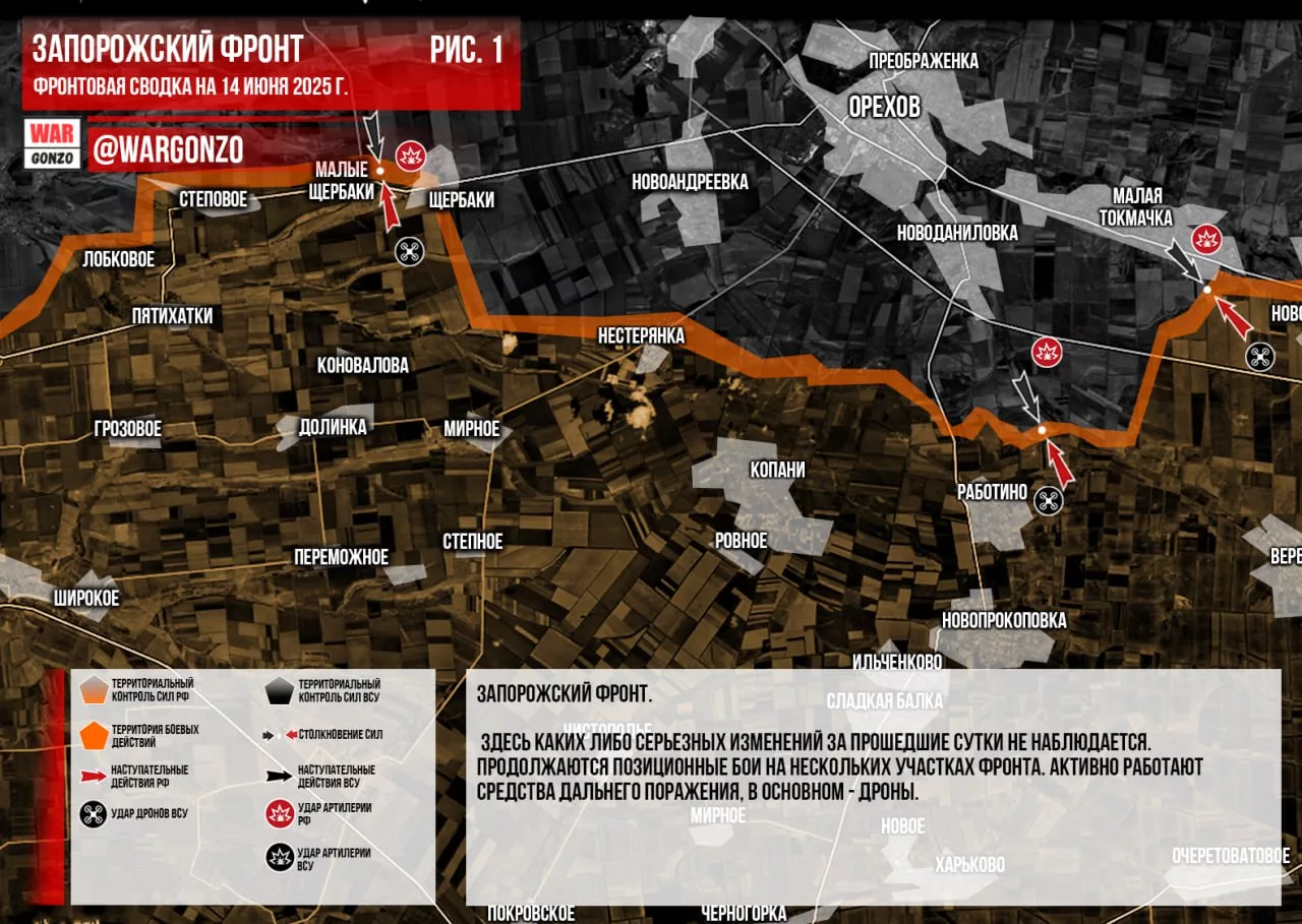 Запорожский фронт. Здесь каких либо серьезных изменений за прошедшие сутки не наблюдается. Продолжаются позиционные бои на нескольких участках фронта. Активно работают средства дальнего поражения, в основном — дроны. (Рис. 1)