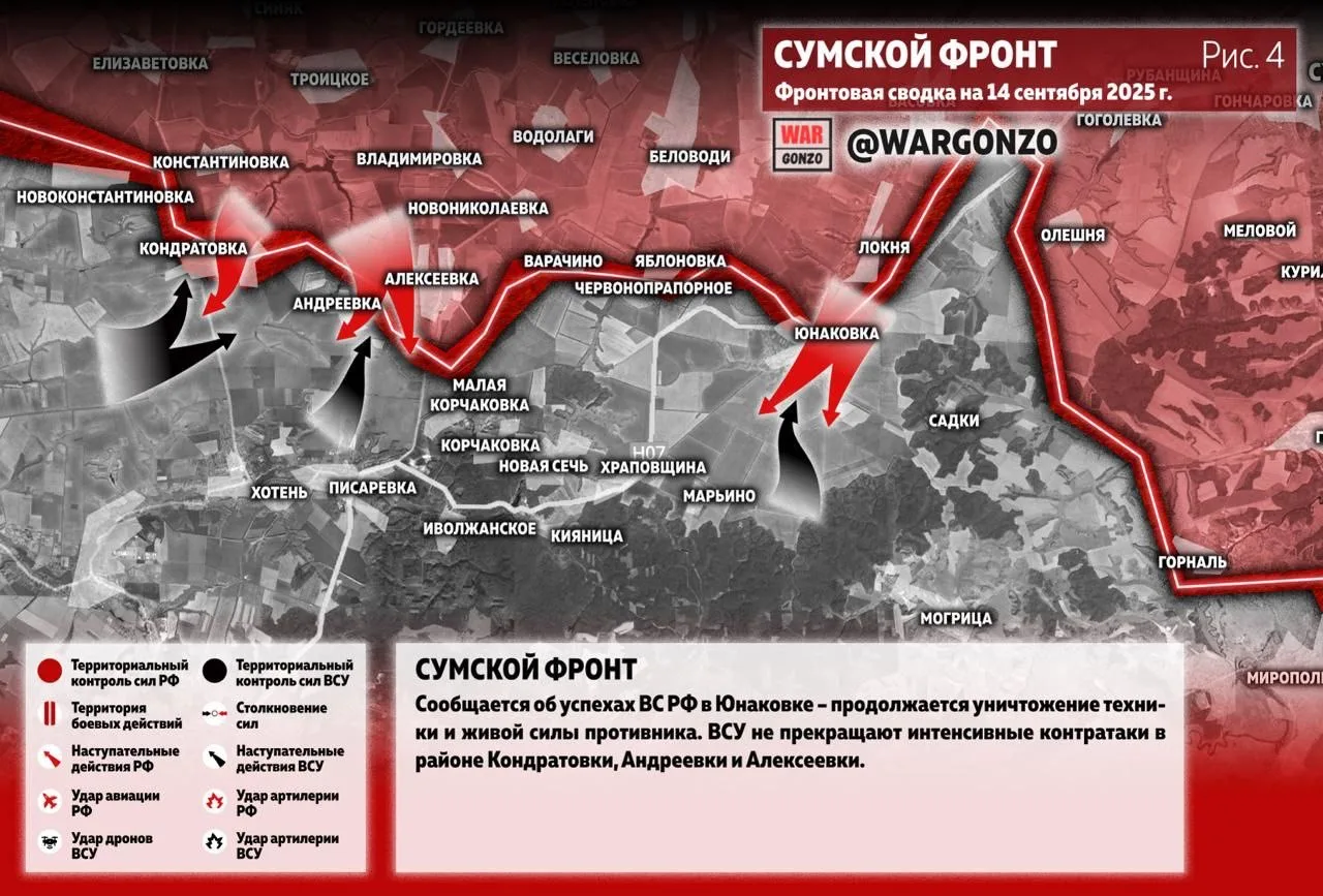 Сообщается об успехах ВС РФ в Юнаковке – продолжается уничтожение техники и живой силы противника. ВСУ не прекращают интенсивные контратаки в районе Кондратовки, Андреевки и Алексеевки. (Рис. 4)