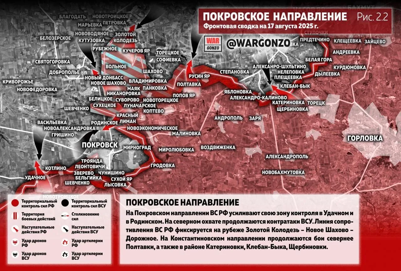 Донецкий фронт. Минобороны РФ сообщило об освобождении села Вороное. По сведениям отдельных источников, населённый пункт Январское перешёл в серую зону. В районе Темировки продолжается продвижение войск РФ. На Покровском направлении ВС РФ усиливают свою зону контроля в Удачном и в Родинском. На северном охвате продолжаются контратаки ВСУ. Линия сопротивления ВС РФ фиксируется на рубеже Золотой Колодезь – Новое Шахово – Дорожное. На Константиновском направлении продолжаются бои севернее Полтавки, а также в районе Катериновки, Клебан-Быка, Щербиновки. (Рис. 2)