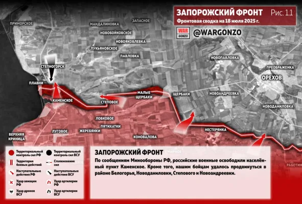 Запорожский фронт. По сообщениям Минообороны РФ, российские военные освободили населённый пункт Каменское. Кроме того, нашим бойцам удалось продвинуться в районе Белогорья, Новоданиловки, Степового и Новоандреевки. На Гуляйпольском направлении активизировались бои на участке Марфополь-Гуляйполе. Российские артиллеристы атакуют резервы противника в самом Гуляйполе. (Рис.1.)