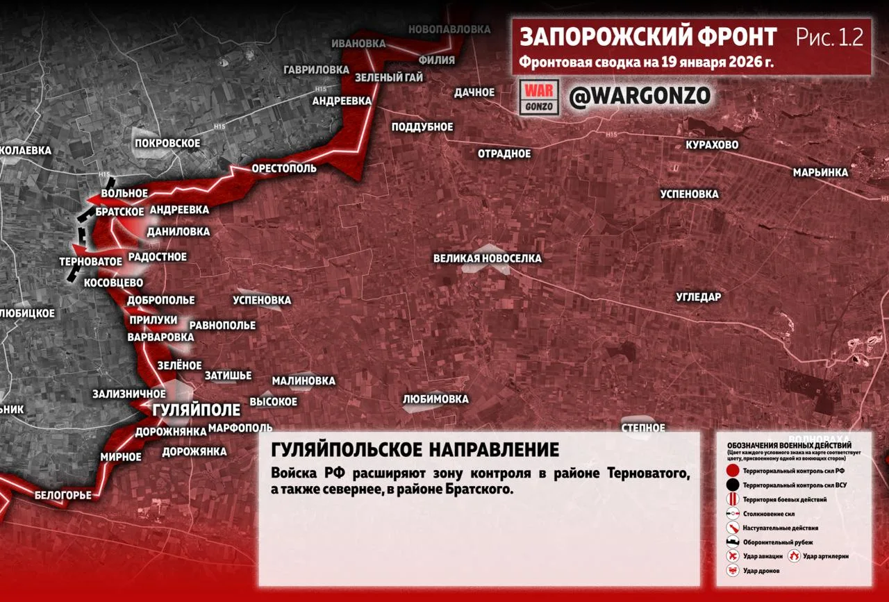 Запорожский фронт Продолжаются бои в районе Лукьяновского — в Новояковлевке, Павловке и Новобойковском. На Ореховском направлении ВС РФ начали продвижение восточнее Щербаков. (Рис. 1.1) На Гуляйпольском направлении войска РФ расширяют зону контроля в районе Терноватого, а также севернее, в районе Братского. (Рис. 1.2)