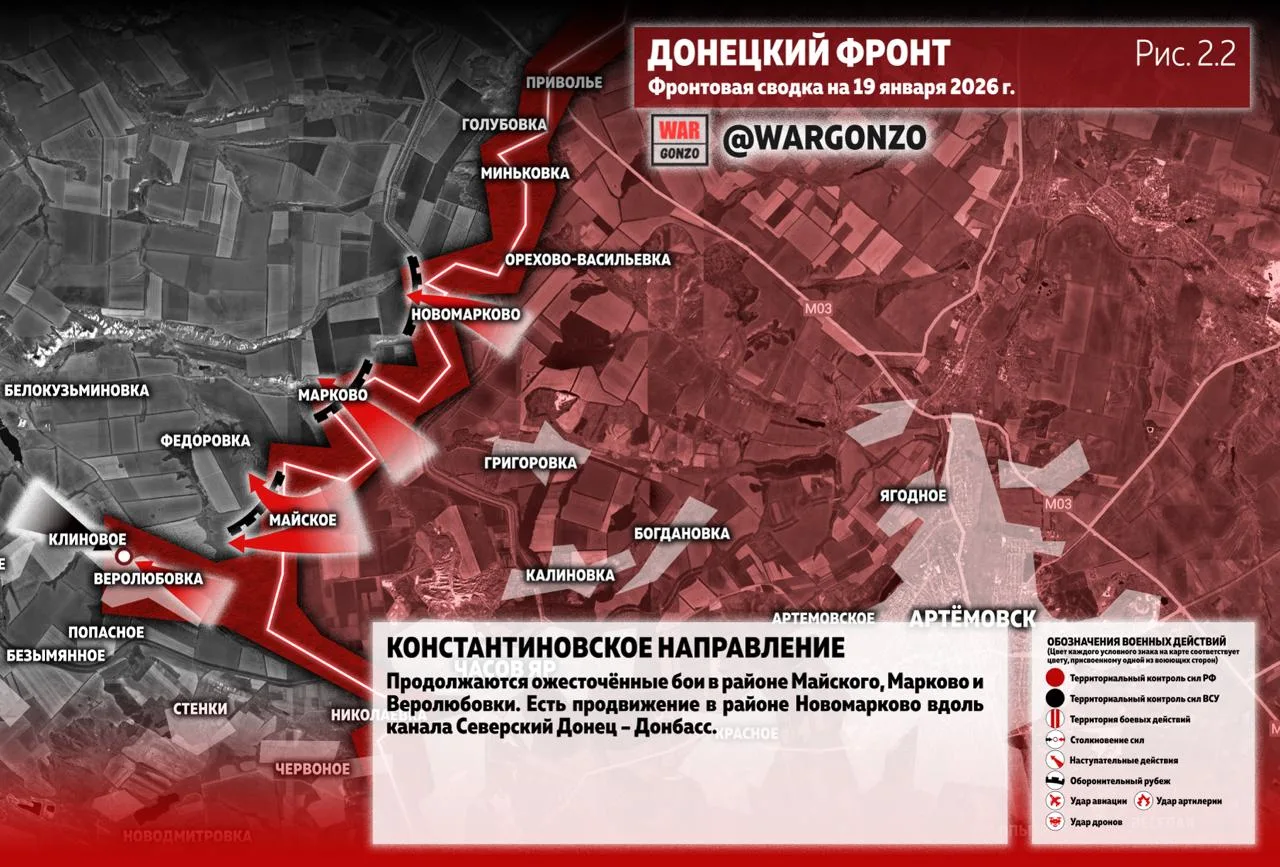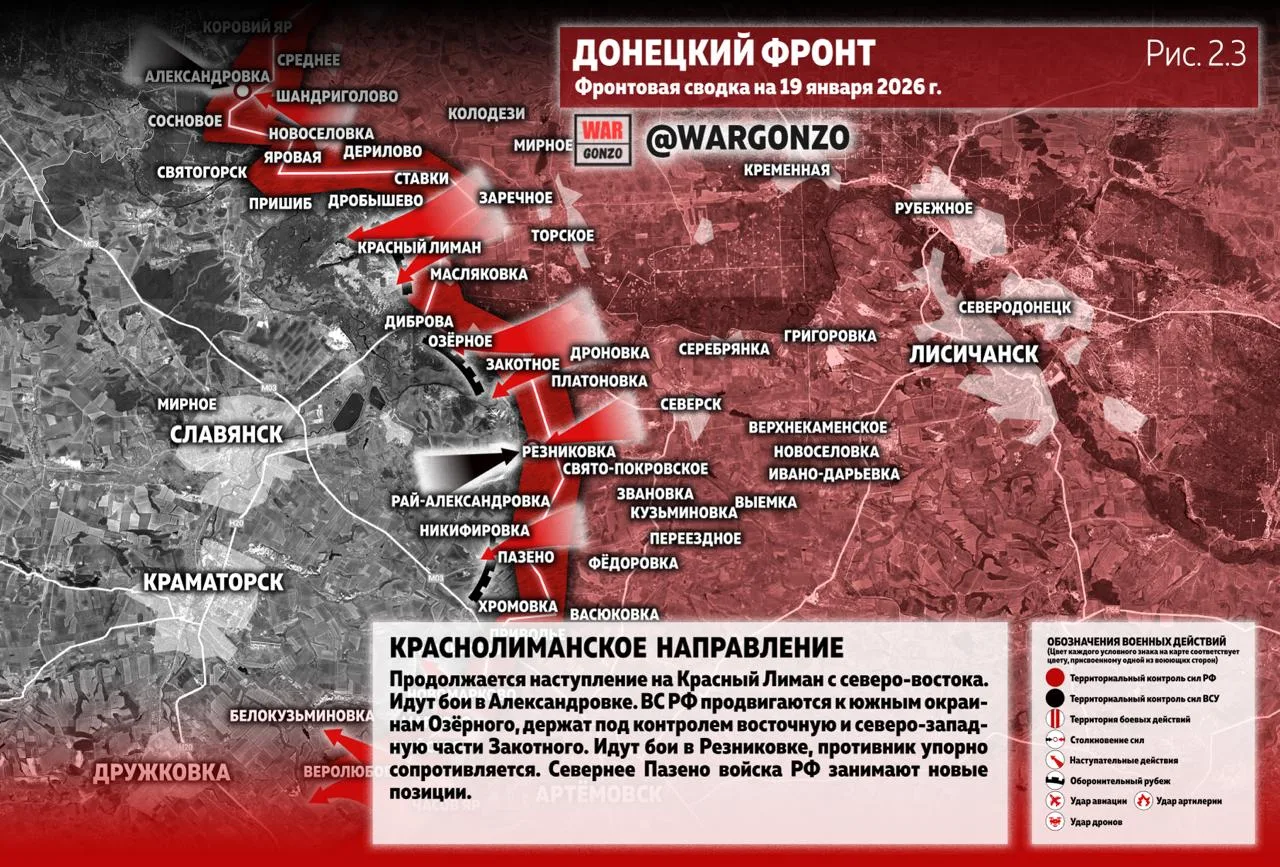 Донецкий фронт На Красноармейском направлении войска РФ расширяют зону контроля на участке Гришино–Родинское. На Добропольском направлении ВС РФ ведут наступление от Нового Шахово к Новому Донбассу. Сообщается о боях на южных окраинах Новопавловки, а также в районе села Затышок (Суворово), куда противник стягивает резервы. (Рис. 2.1) На Константиновском направлении идёт зачистка территории на северном берегу Клебан-Быкского водохранилища. Сообщается о продвижении к Ильиновке, на участке идут бои. ВС РФ расширяют зону контроля на участке Ступочки–Предтечино. Продолжаются ожесточённые бои в районе Майского, Марково и Веролюбовки. Есть продвижение в районе Новомарково вдоль канала Северский Донец – Донбасс. (Рис. 2.2) На Краснолиманском направлении продолжается наступление на Красный Лиман с северо-востока. Идут бои в Александровке. ВС РФ продвигаются к южным окраинам Озёрного, держат под контролем восточную и северо-западную части Закотного. Идут бои в Резниковке, противник упорно сопротивляется. Севернее Пазено войска РФ занимают новые позиции. (Рис. 2.3)