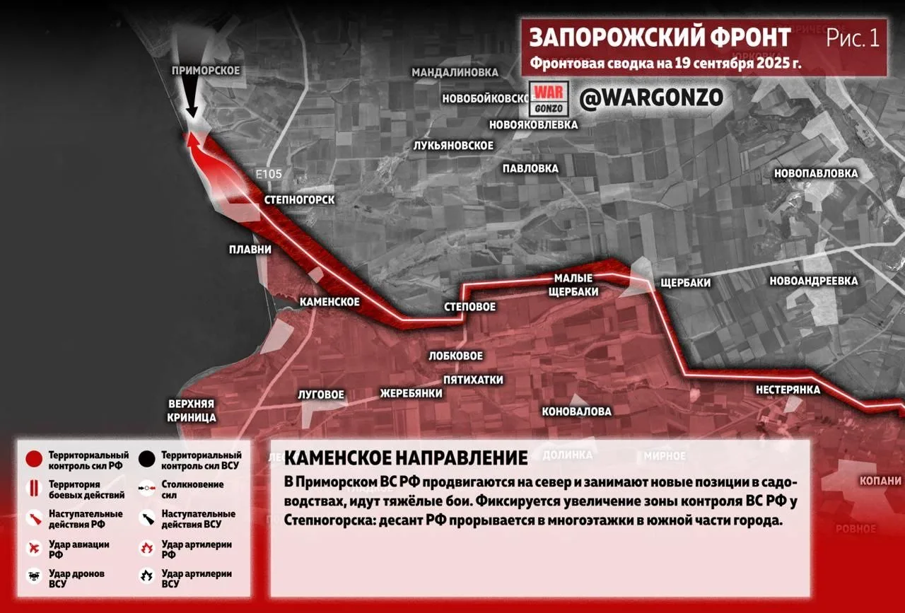 В Приморском ВС РФ продвигаются на север и занимают новые позиции в садоводствах, идут тяжёлые бои. Фиксируется увеличение зоны контроля ВС РФ у Степногорска: десант РФ прорывается в многоэтажки в южной части города. (Рис. 1)