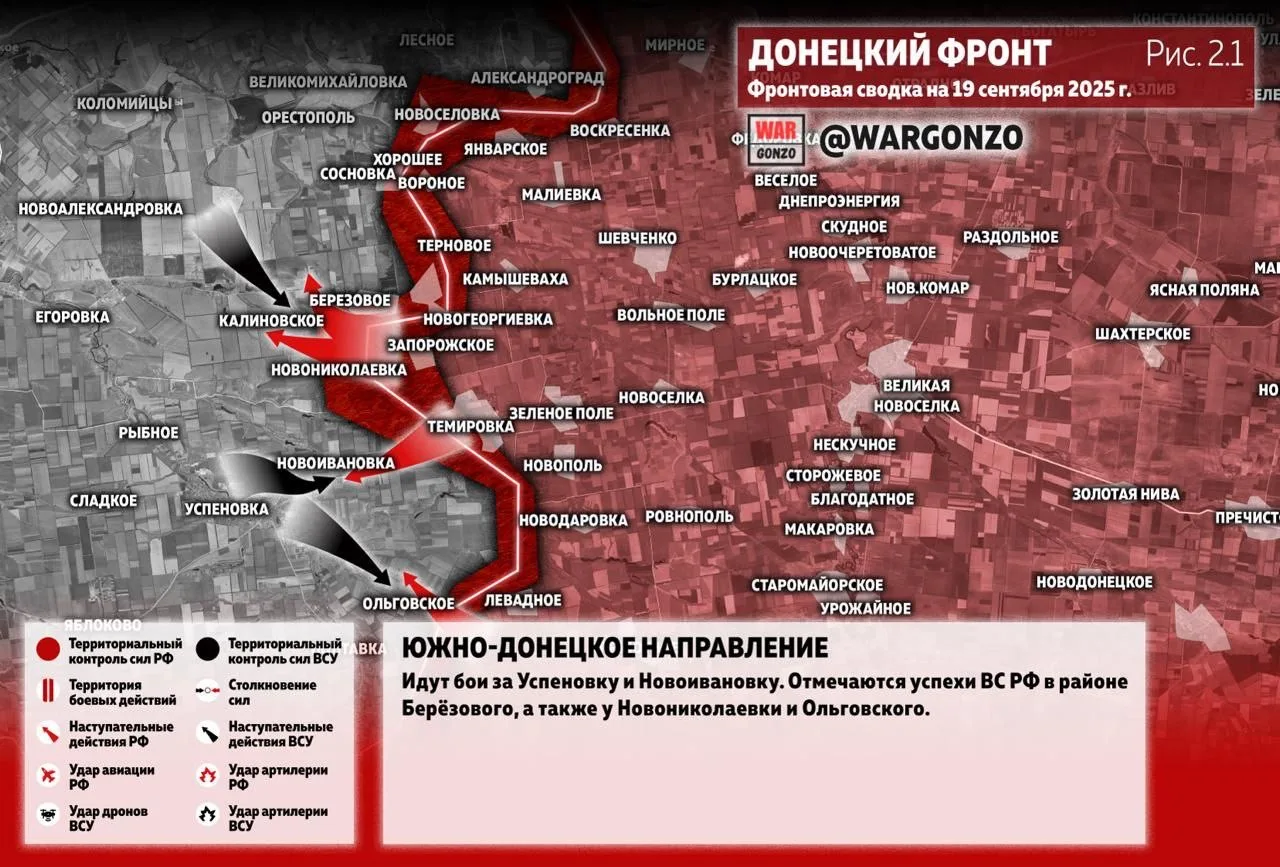 На Южно-Донецком направлении идут бои за Успеновку и Новоивановку. Отмечаются успехи ВС РФ в районе Берёзового, а также у Новониколаевки и Ольговского. (Рис. 2.1)