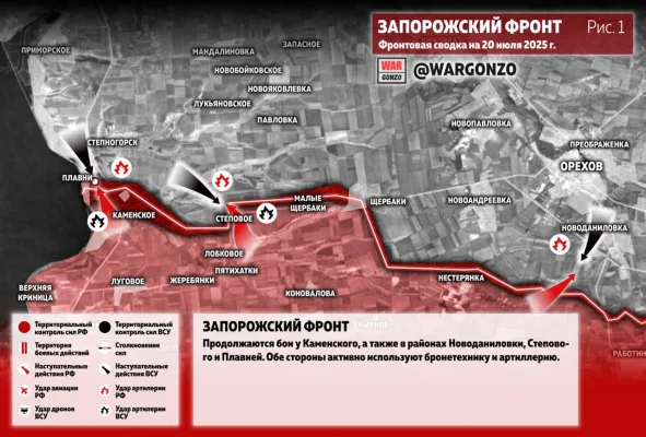 Запорожский фронт. Продолжаются бои у Каменского, а также в районах Новоданиловки, Степового и Плавней. Обе стороны активно используют бронетехнику и артиллерию. (Рис.1.)